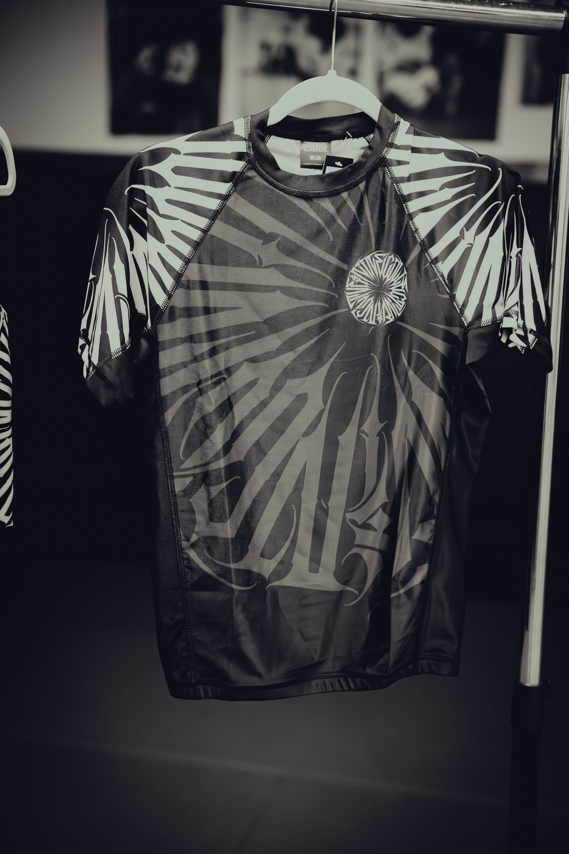 This rash guard was crafted with the support of Combat Corner’s professional production platform, which includes their minimal branding on the piece. This is not a collaboration—simply the system used to bring this design to life.