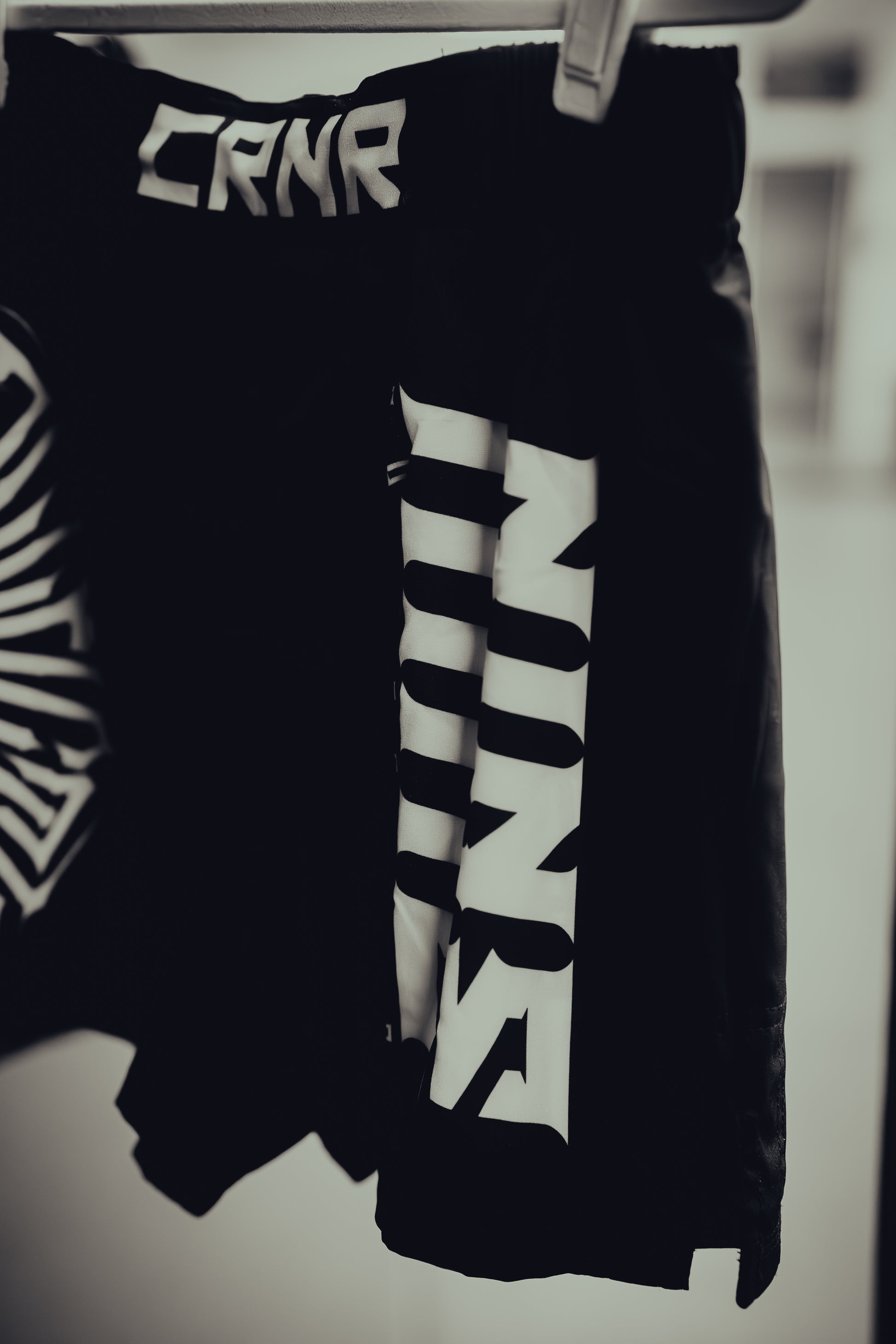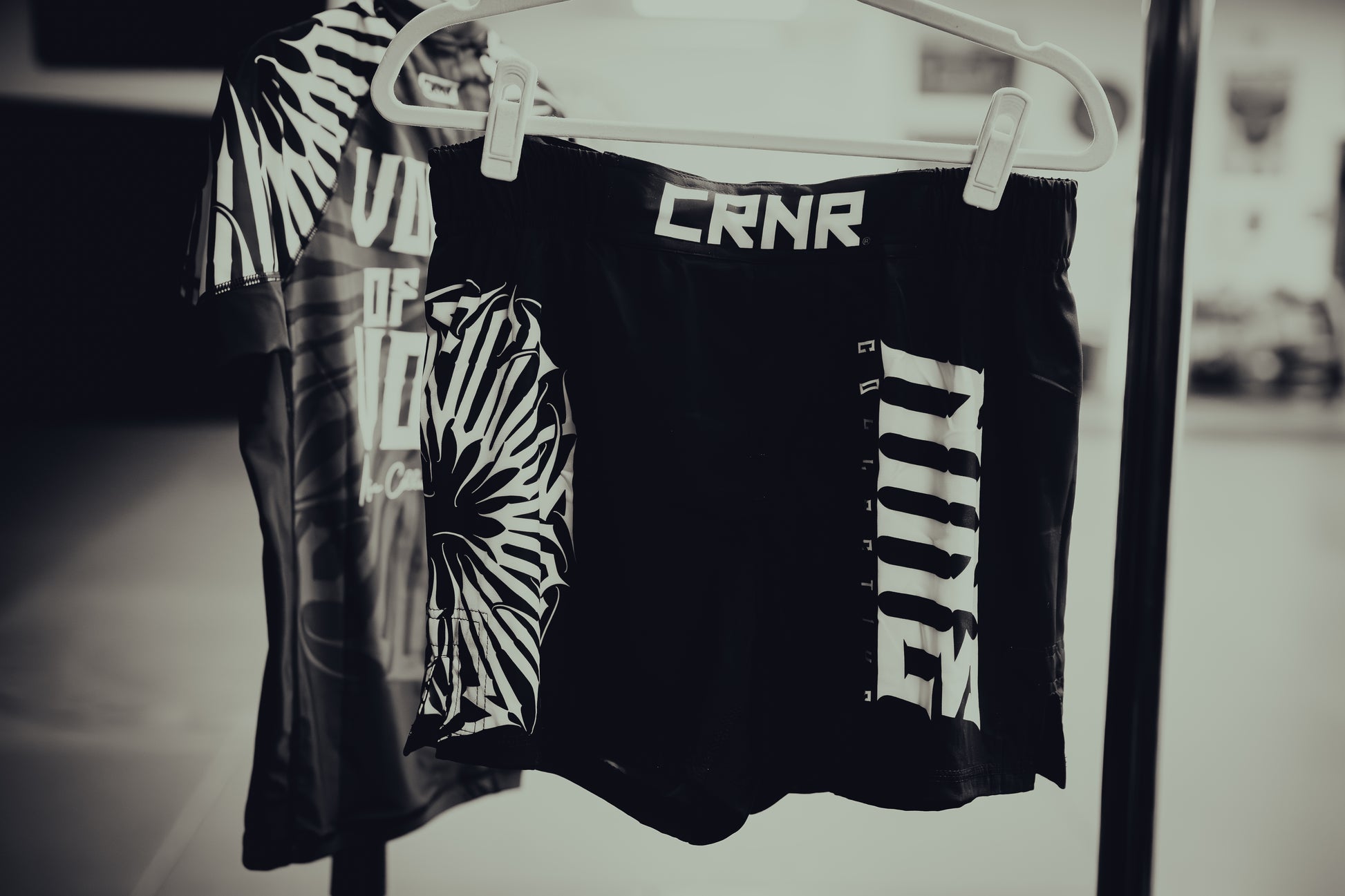 These combat shorts were crafted with the support of Combat Corner’s professional production platform, which is why their minimal branding appears on the garment. This is not a collaboration—only the system used to produce this run.